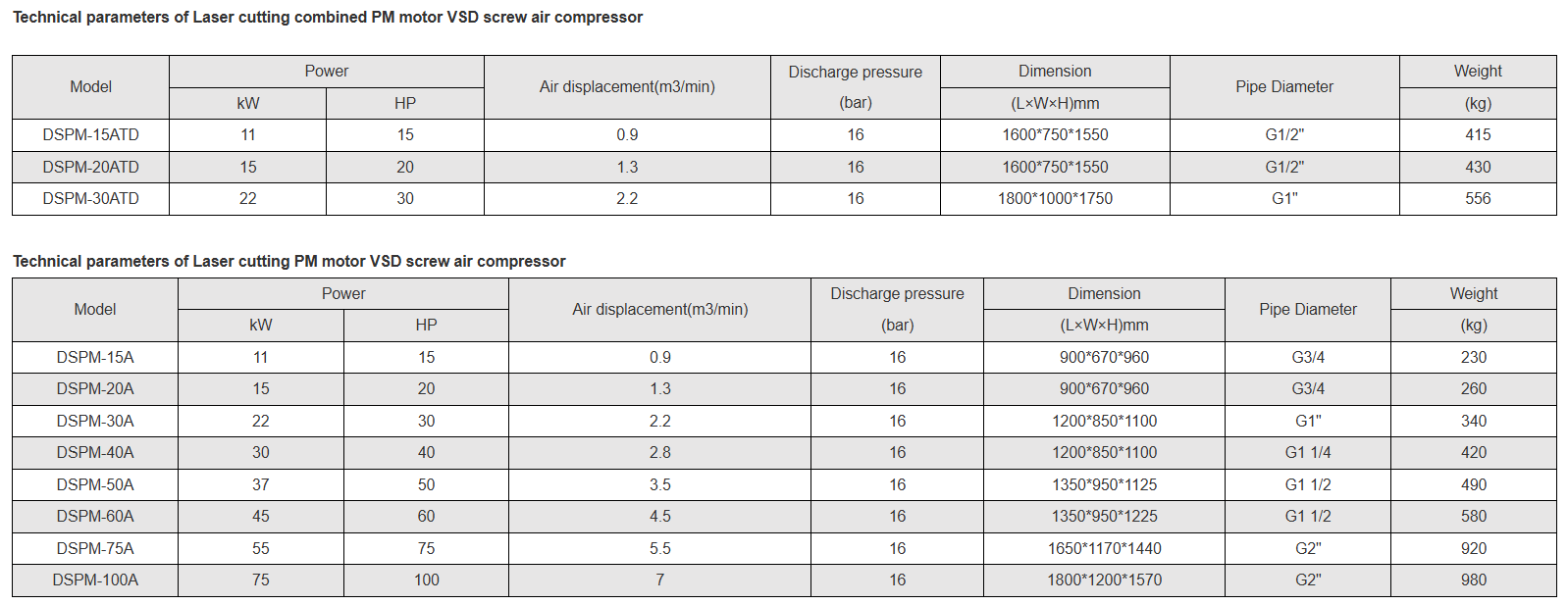 With the development of science and technology, more and more metal machining enterprises choose to use laser cutting machine, the use of laser cutting machine must be equipped with high quality, high pressure, low water vapor air compressor. For this reason, Desran compressor specially customized 16 bar combined permanent magnet variable frequency screw compressor for laser cutting machine. It integrates permanent magnet variable frequency screw compressor, air dryer, air tank and high efficiency filter, which can directly output high-quality 16 bar compressed air and perfectly cooperate with laser cutting machine.