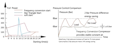 ◆ Under the inconstant air demand, the frequency conversion system can start without peak current, which avoids the overload and allows the compressor to stop frequently.